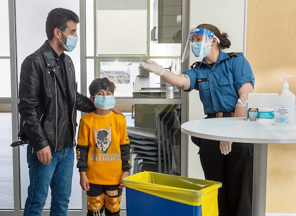 Sailor Second Class Hannah Angel directs Satam Alhasoun, left, and his son Mohammed Alhasoun as they arrive for COVID-19 testing in Halifax on Wednesday, April 28, 2021. More than 70 Canadian Armed Forces members have been assigned to assist with COVID-19 testing in Nova Scotia.Andrew Vaughan/The Canadian Press