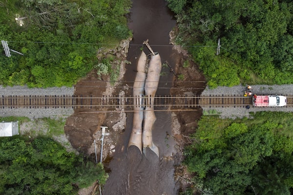 Workers with CN Rail assess the damage to a washed-out rail line outside of Truro, N.S. on July 23. A long procession of intense thunderstorms dumped record amounts of rain across a wide swath of Nova Scotia, causing flash flooding, road washouts and power outages.Darren Calabrese/The Canadian Press