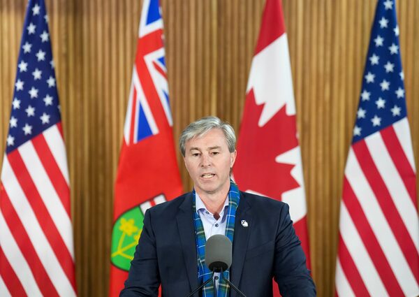 Nova Scotia Premier Tim Houston holds a news conference regarding tariffs from the United States at Queen's Park in Toronto on March 4.Nathan Denette/The Canadian Press