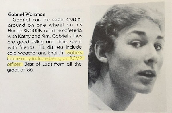 “His dislikes include cold weather and English,” the yearbook said. "Gabe’s future may include being an RCMP officer.”