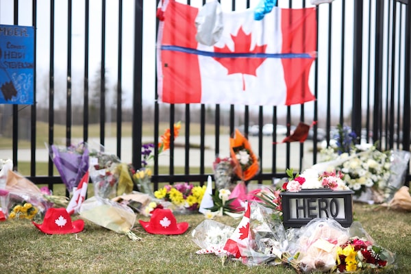 A makeshift shrine honouring Const. Heidi Stevenson is shown outside RCMP headquarters in Dartmouth, N.S., Friday, April 24, 2020.Riley Smith/The Canadian Press