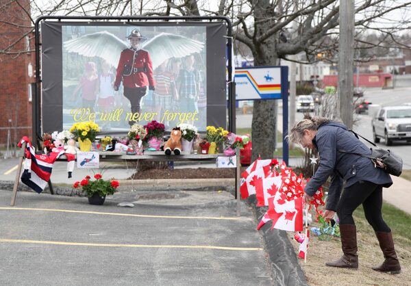 A woman places a pinwheel in front of a mural dedicated to slain RCMP Const. Heidi Stevenson, prior to a province-wide, two minutes of silence for the 22 victims of last weekend's shooting rampage, held in front of the RCMP detachment in Cole Harbour, N.S., Friday, April 24,Tim Krochak/The Canadian Press