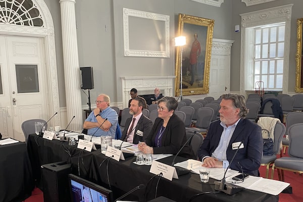 Right to left: Nova Scotia Power CEO Peter Gregg, Nova Scotia deputy minister of natural resources Karen Gatien and department officials David Miller and Keith Collins attend a committee meeting in Halifax, on April 23.Keith Doucette/The Canadian Press