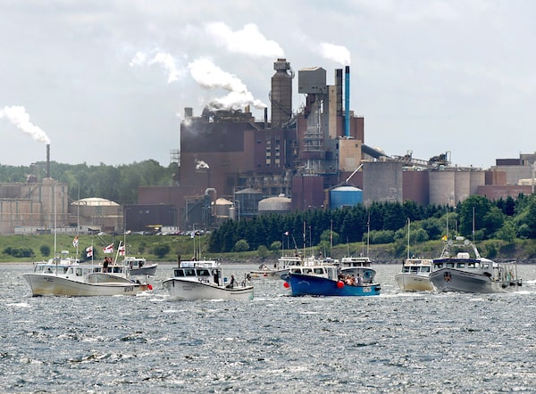 Fishing boats pass the Northern Pulp mill as concerned residents, fishermen and Indigenous groups protest the mill's plan to dump millions of litres of effluent daily into the Northumberland Strait in Pictou, N.S., on July 6, 2018.Andrew Vaughan/The Canadian Press