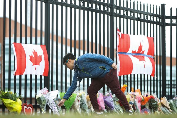 A person leaves flowers at a make-shift memorial dedicated to Constable Heidi Stevenson at RCMP headquarters in Dartmouth, N.S., on April 20, 2020.Riley Smith