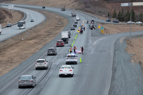 Sipekne'katik First Nation members protest along a highway in N.S. on April 2.Ted Pritchard/The Canadian Press