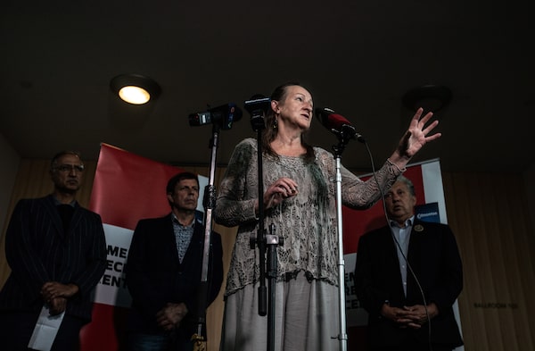 Premier Caroline Cochrane of the Northwest Territories has announced she won't be running for re-election in November. Cochrane speaks about the wildfire situation after visiting evacuees in Edmonton on Aug. 30.JASON FRANSON/The Canadian Press