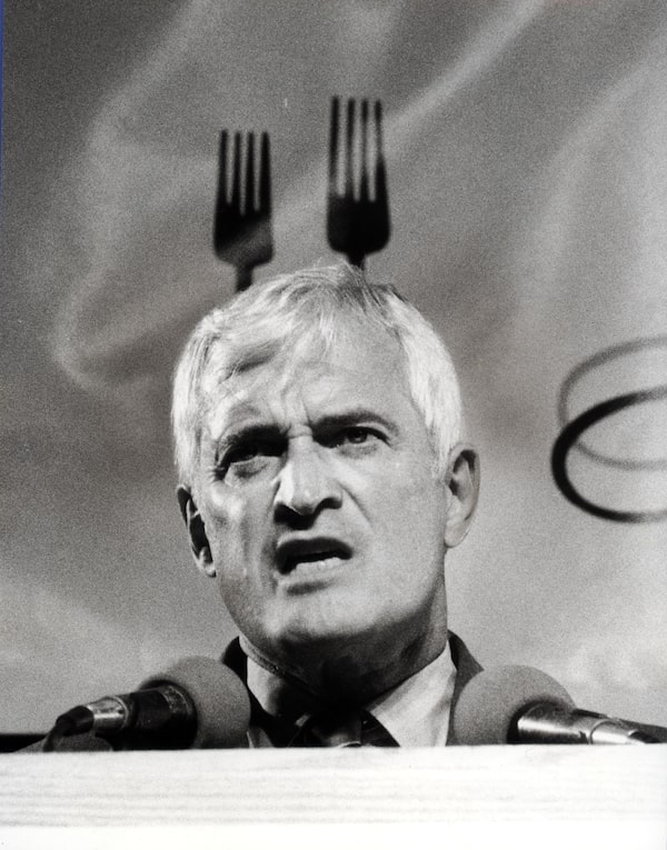 Aug. 24, 1984: Turner addresses a group of non-partisan women at a Toronto lunch. The forks behind him are part of a banner reading 'Lunches with Leaders.'Tibor Kolley/The Globe and Mail