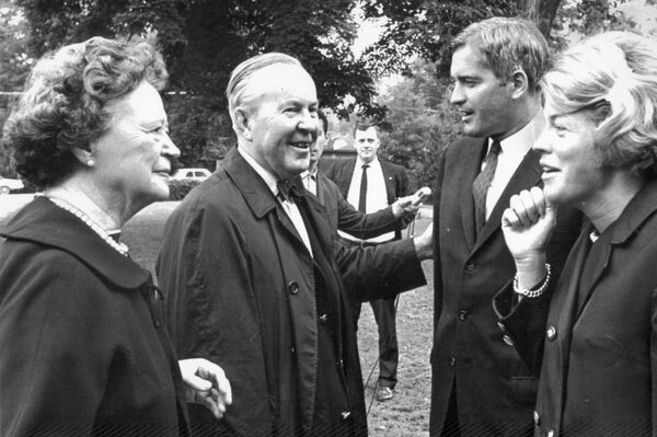 June 25, 1968: Turner and his wife Geills, right, chat with prime minister Lester Pearson and his wife, Maryon, outside an Ottawa polling station.The Canadian Press