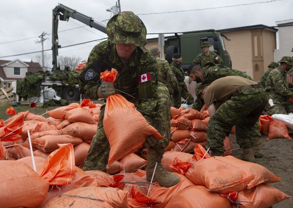 Members of the Canadian Forces prepare sandbags for distribution to residents threatened by floodwaters on April 24, 2019 in Gatineau, Que.Adrian Wyld/The Canadian Press