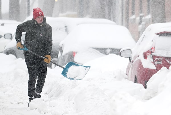 A person clears snow from around a car during a snowstorm in Montreal on Feb. 16.Graham Hughes/The Canadian Press