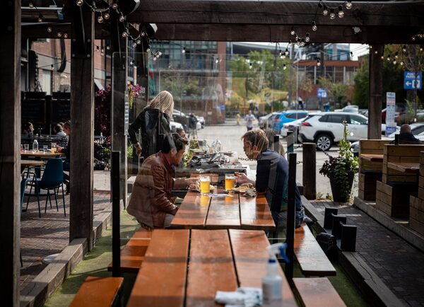 A restaurant patio in Toronto’s Liberty Village neighbourhood, seen here on Oct. 9, 2020, has no heaters, but saw a fair number of patrons during the lunch rush.Melissa Tait/The Globe and Mail