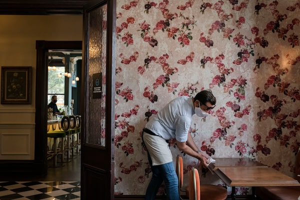 Momir Lovric, server at Oliver & Bonacini Hospitality's Maison Selby restaurant, disinfects surfaces after a seating, in Toronto on Sept., 18, 2020.Christopher Katsarov/The Globe and Mail