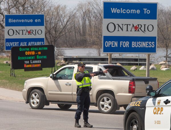 An Ontario Provincial Police officer directs travellers entering the province from Quebec on April 19, 2021, in Hawkesbury, Ont.Ryan Remiorz/The Canadian Press