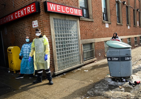 A worker and a paramedic stand outside Toronto's Maxwell Meighen homeless shelter on Feb. 24, 2021.Nathan Denette/The Canadian Press