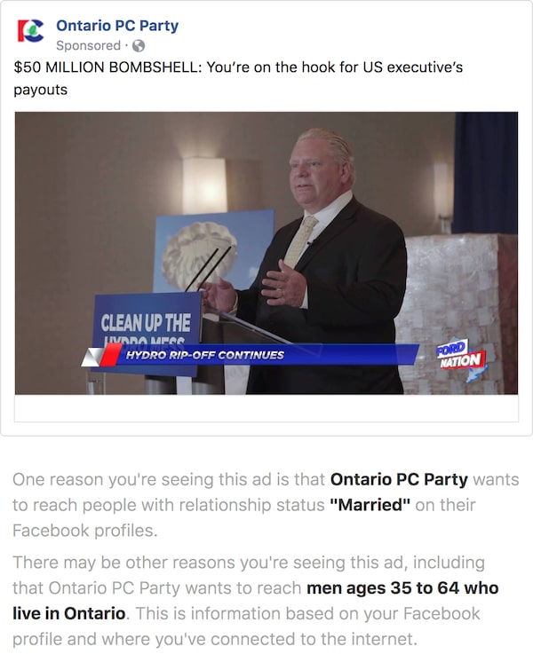 The Globe, in partnership with U.S. journalism non-profit ProPublica, has been studying the ways that campaigns and outside political entities are micro-targeting Ontario’s voters. (If you want to help us, learn more here about how to install a browser extension designed by ProPublica and what we’re doing with the information.) Here are some of the trends emerging so far: