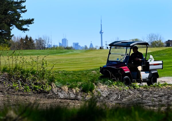 A worker drives a golf cart at the closed Toronto Golf Club in Mississauga, Ont., on May 12, 2021.Nathan Denette/The Canadian Press