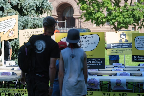 A mock classroom was set up on the lawn of Queens Park on Aug. 12 to demonstrate what some are calling inadequate plans by the Ford government to reopen schools safely amid the ongoing COVID-19 pandemic.Yader Guzman/The Globe and Mail