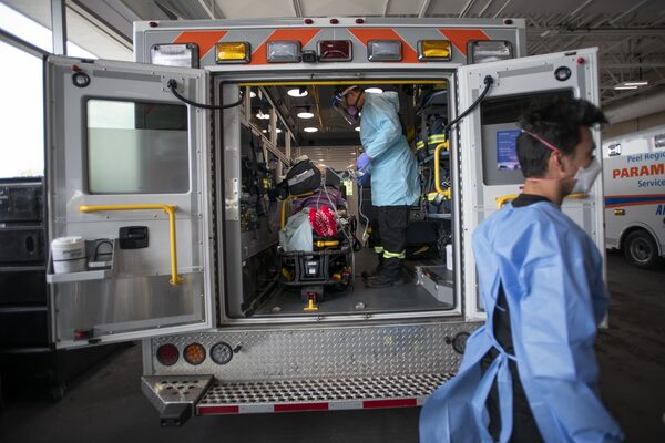 Paramedics prepare to transfer COVID-19 patient John Wylie, 76, from Brampton Civic Hospital, to Halton Health Care, on May 25.Fred Lum/the Globe and Mail