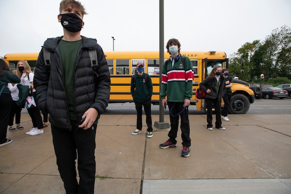 After being dropped off by school bus, grade nine students gather outside Patrick Fogarty High School in Orillia, Ont. on Sept 10 2020.Fred Lum/The Globe and Mail