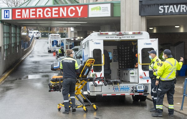 Paramedics and ambulances spill out of the emergency ramp at Michael Garron Hospital in Toronto on April 12, 2021.Frank Gunn/The Canadian Press