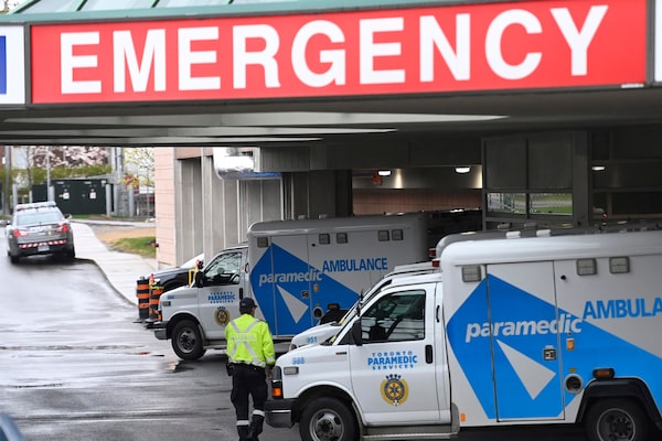 Ambulances are parked at the emergency room entrance at the Michael Garron Hospital, in Toronto, on April 29, 2021.Frank Gunn/The Canadian Press