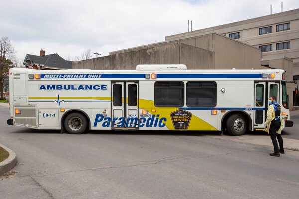Paramedics and security outside the Kingston General Hospital after dropping off COVID-19 patients from the GTA area, in Kingston, Ontario on April 22, 2021.Lars Hagberg/The Canadian Press