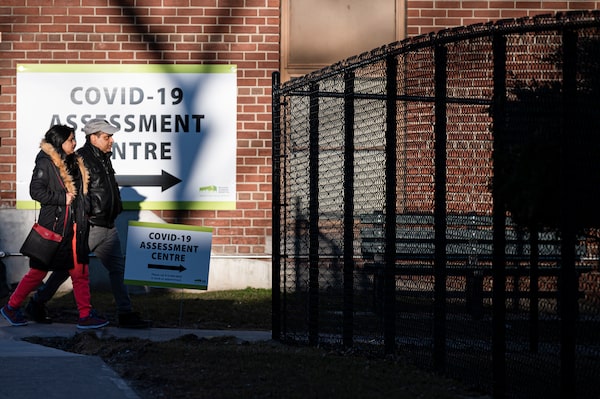 People walk towards a Covid-19 Assessment Centre at Michael Garron Hospital, in Toronto, on March 15, 2020.Christopher Katsarov/The Globe and Mail