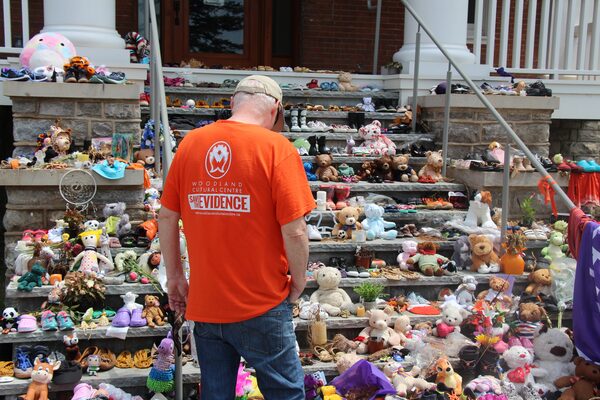 Flowers, shoes and toys sit on the steps of the main entrance of The Mohawk Institute , a former residential school for First Nations children, in Brantford, Ont., on June 27, 2021., to honour the 215 children whose remains were discovered in a mass grave at a former residential school in Kamloops.Anadolu Agency/Getty Images
