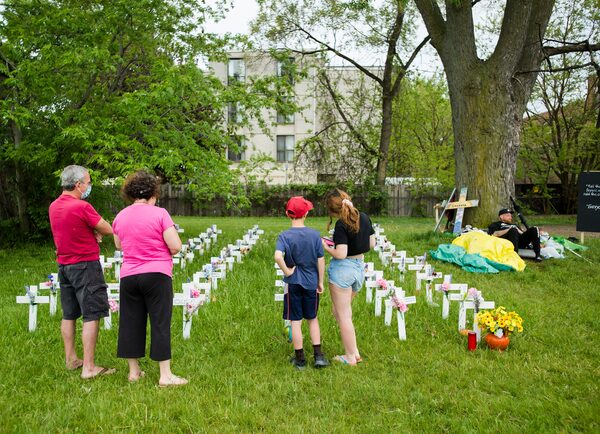 The Ontario government appointed Trillium Health Partners to temporarily take over management of Camilla Care Community in Mississauga on May 27 – people visit crosses outside the Camilla Care as Innis Ingram, right, sits chained to a tree seen here on May 29, 2020.Nathan Denette/The Canadian Press