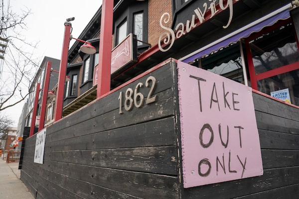 A restaurant in Toronto displays a 'Take Out Only' sign on March 18, 2020.Frank Gunn/The Canadian Press