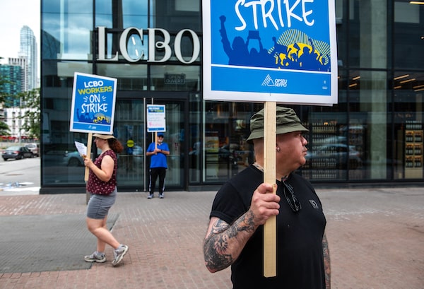 Employees picket outside of the LCBO headquarters in downtown Toronto on July 5.Laura Proctor/The Globe and Mail