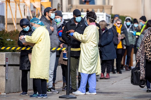 People wait in line to get a COVID-19 test at Mount Sinai Hospital in Toronto, on Nov. 23, 2020.CARLOS OSORIO/Reuters