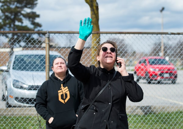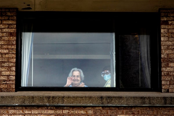 Betty Fernandez waves to her 95-year-old mother Alicia Tamayo 95 at the Eatonville Care Centre, in Toronto on Tuesday, April 14, 2020.Nathan Denette/The Canadian Press
