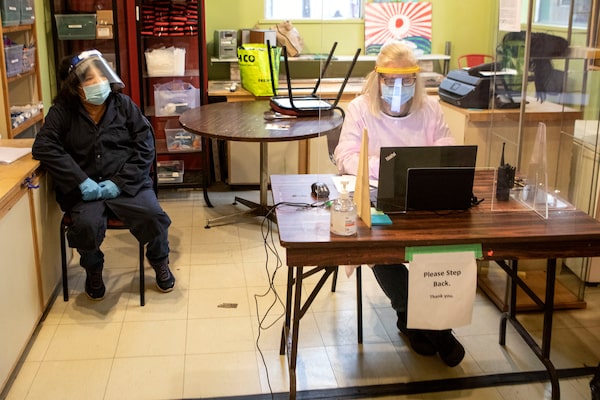 Peer support worker Jenny Nakogee, left, and program worker Barbara Pandza wait to screen clients at The Meeting Place in Toronto on Dec. 4, 2020.Chris Young/The Canadian Press
