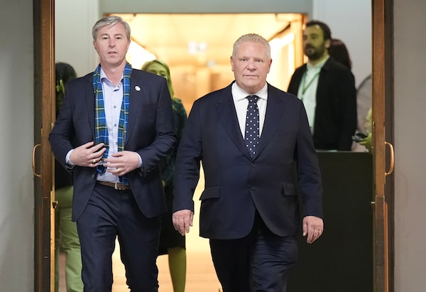 Ontario Premier Doug Ford, left, arrives with Nova Scotia Premier Tim Houston as they hold a press conference at Queen's Park in Toronto on March 4, regarding the new tariffs that the U.S. placed on Canada.Nathan Denette/The Canadian Press