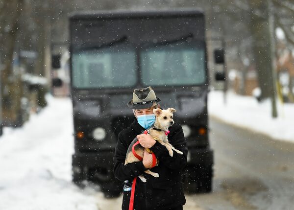 A man wearing a protective mask carries his dog in snowy conditions in Toronto on Feb. 19, 2021. Ontario has thus far focused its COVID-19 vaccine rollout on the highest-priority groups, including long-term care residents.Nathan Denette/The Canadian Press