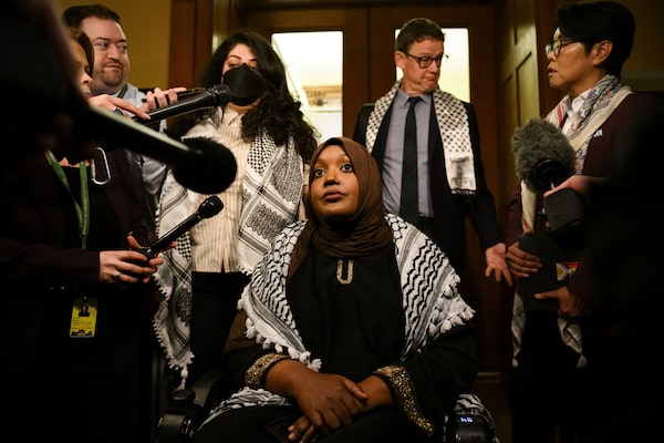 MPP Sarah Jama speaks to press after being asked by the Speaker of the House Ted Arnott to leave the Ontario legislature during question period in Toronto on May 6.Christopher Katsarov/The Canadian Press