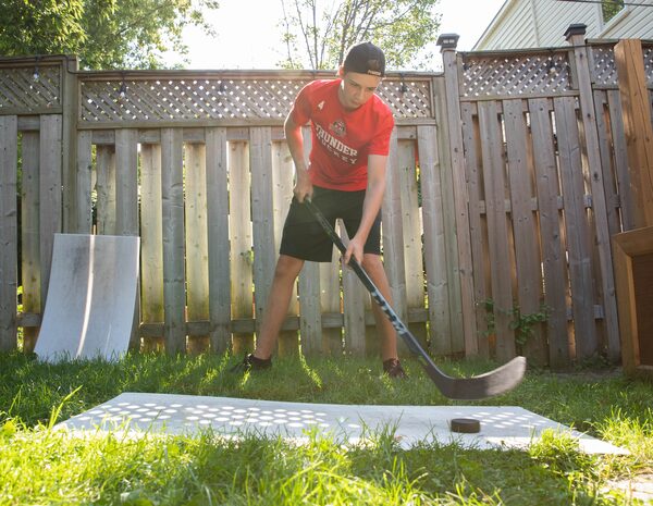 Will Madge, 15, a grade 10 student in Toronto, practices his puck handling skills in his backyard. Since beginning high school, he has not been able to play sports at all due to COVID-19.Jessica Lee/The Globe and Mail