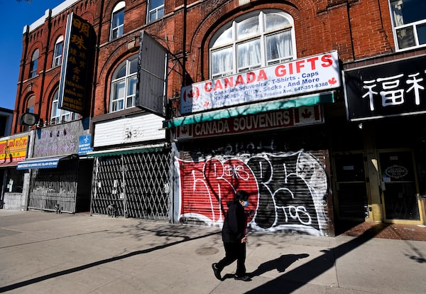 A person walks past closed businesses on Spadina Avenue in Chinatown in Toronto on May 13, 2021.Nathan Denette/The Canadian Press