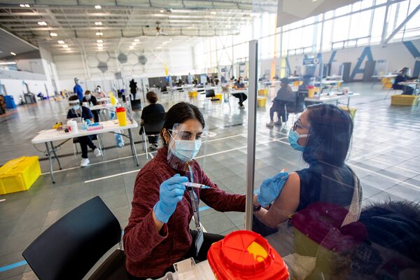 Nurse Mandeep Kaur administers a dose of the Moderna COVID-19 vaccine to health administrator, Brittany Orantes, at a vaccination centre as part of the COVID-19 vaccination campaign, in Brampton, Ont., March 4, 2021.CARLOS OSORIO/Reuters