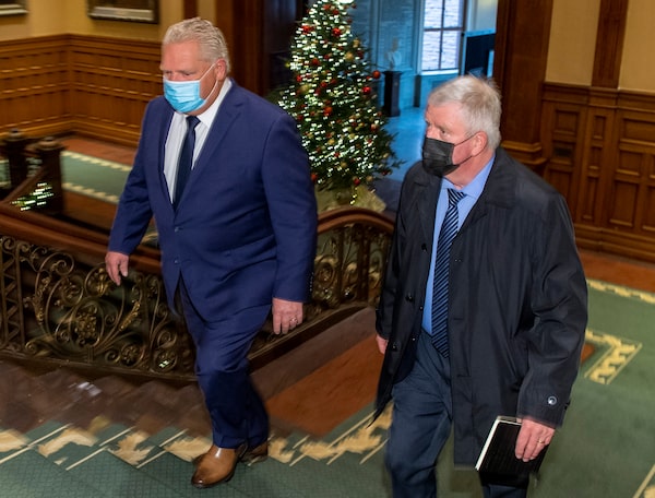Ontario Premier Doug Ford and former head of the Canadian Armed Forces Gen. Rick Hillier walk to the Premer's office at the Ontario Legislature, in Toronto, on Nov. 27, 2020.Frank Gunn/The Canadian Press