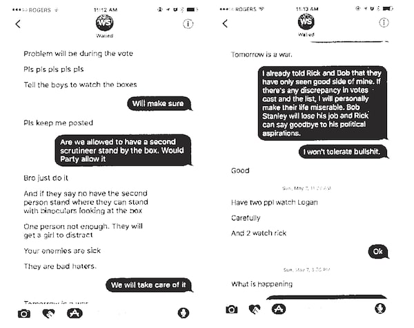 “Problem will be during the vote,” Mr. Soliman wrote the day before the meeting. “Pls pls pls pls pls Tell the boys to watch the boxes.” He went on to say that if officials refused to allow a second scrutineer at the ballot boxes that Mr. Sidhu should have someone “stand with binoculars looking at the box. One person not enough. … Tomorrow is a war.”