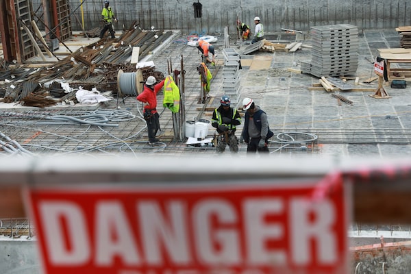 Construction workers build a condominium tower in Toronto, on March 26, 2020. A union representing Ontario's construction industry said its workers cannot use the COVID Alert app because they can't have phones on job sites.CHRIS HELGREN/Reuters
