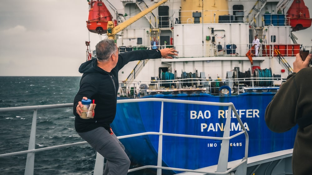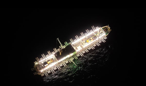 Squid ships – like the Chinese vessel Zhen Fa 7, shown in 2022 – use bright lights to lure squid up from the depths. The crew face long hours and can sometimes be at sea for a long time, thanks to the practice of offloading their catches at sea onto other ships, rather than going ashore themselves.Einar Ollua and Esteban Medina San Martin