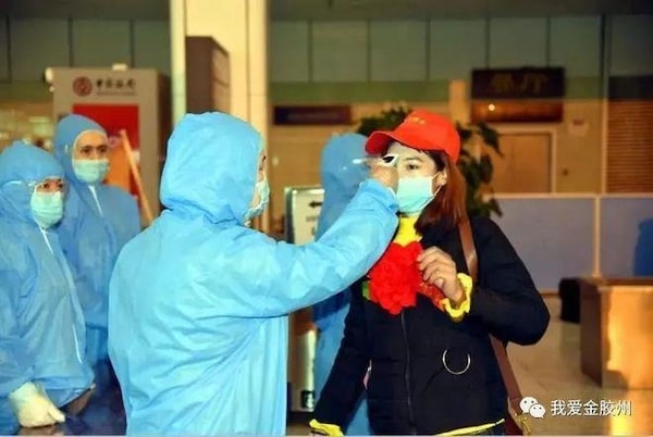 A Uyghur woman’s temperature is logged by an infrared scanner as she is transferred to Qingdao Tianyuan Aquatic Products Co. Ltd. in 2020.Jiaozhou News Center