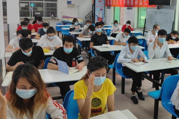Ethnic minority workers at Yantai Sanko Fisheries sit in a political education session in 2021. In China, forced labour and cultural assimilation policies often go hand in hand.Yantai United Front Work Department