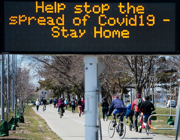 People get exercise outside on the lake shore path along Lake Ontario in Toronto on Thursday. Health officials and the government have asked that people stay inside to help curb the spread of the coronavirus that causes COVID-19.Nathan Denette/The Canadian Press