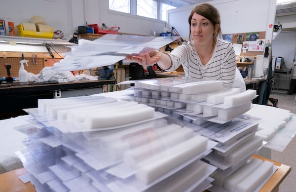 An employee at the Marie Enfant children's rehabilitation stacks visors after gluing a foam support in Montreal on Thursday. Employees from the orthopaedic department are producing an average of 1,500 visors a day for use in Montreal area hospitals.Paul Chiasson/The Canadian Press
