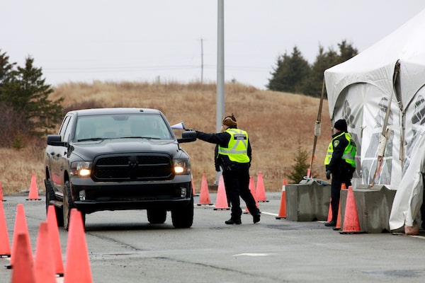 A Nova Scotia conservation officer passes a paper to a person crossing into the province from New Brunswick in its effort to prevent the spread of the novel coronavirus on Thursday.JOHN MORRIS